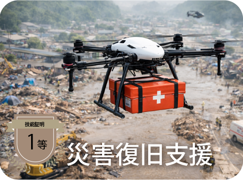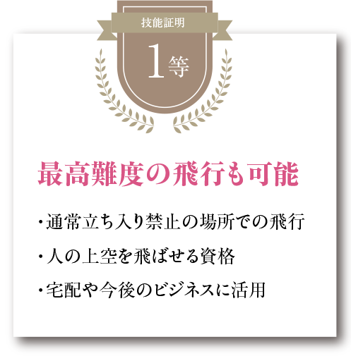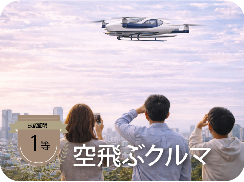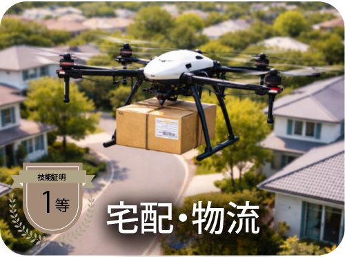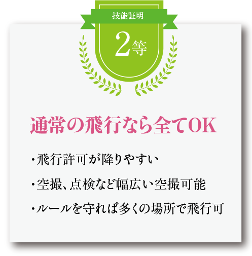 今後期待される「宅配」「物流」「空飛ぶ車」など多くのビジネスシーンでお役に立てるのは1等技能証明になります。2等技能証明は趣味から多くのビジネスシーンで活躍が期待される国家資格です。