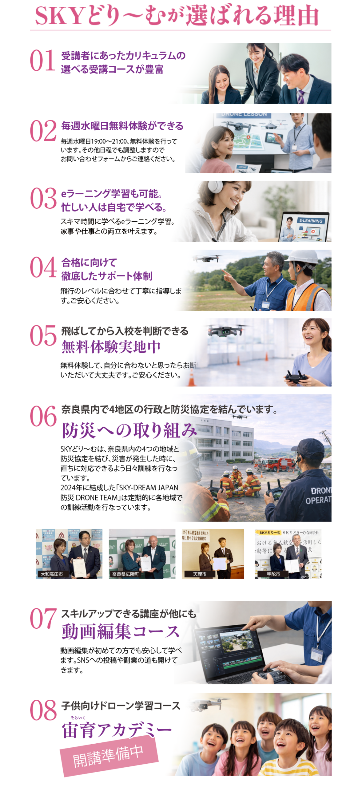 防災チーム「SKY-DREAM JAPAN 防災 DRONE TEAM」に所属するメンバーもおり、ドローンの可能性を引き出すことができる講師陣として行政からも高く評価されています。