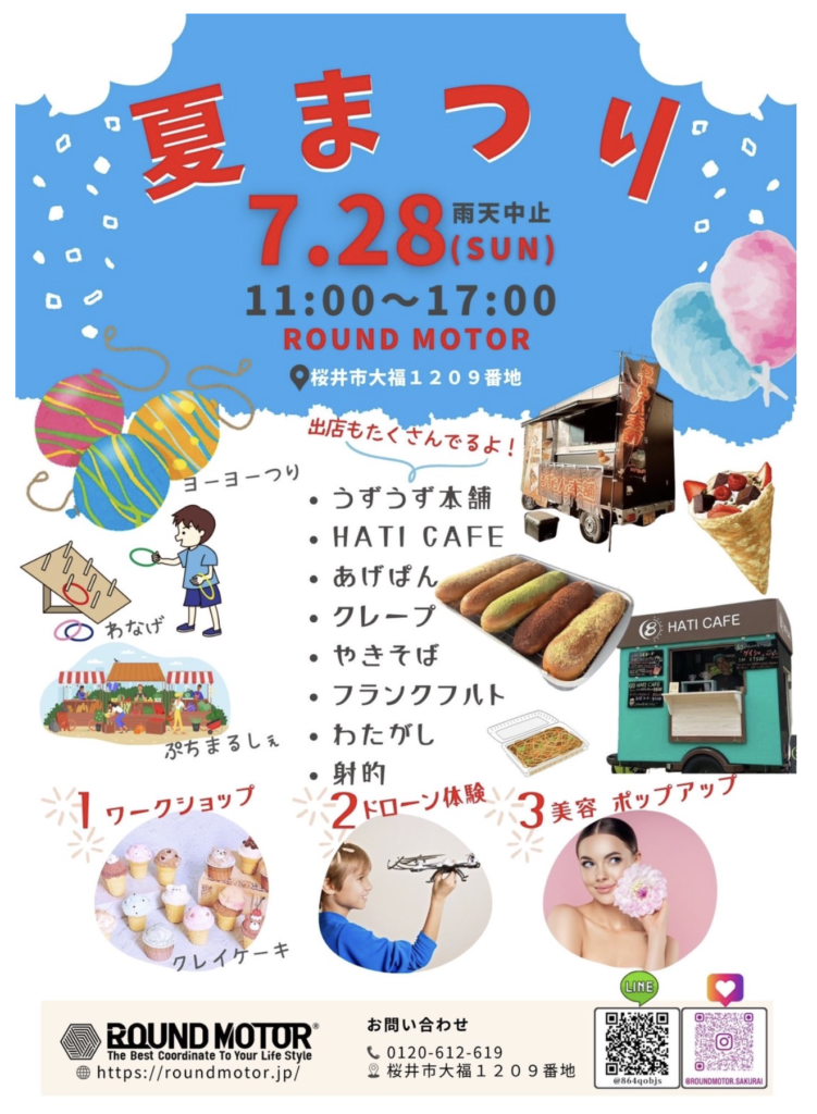 夏まつり 7月28日11時~17時 ドローン体験 2025 12/27 イベントのお知らせ 2024年7月6日2025年12月27日 7月28日(日) ROUND MOTORさんにてドローン体験ができます 下記をクリックするとチラシをダウンロードできます イベントのお知らせ 8月1日~12日まで天理本道りにて「ドローンART」 Camp & DRONE 思い出つくりのおてつだい