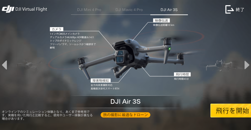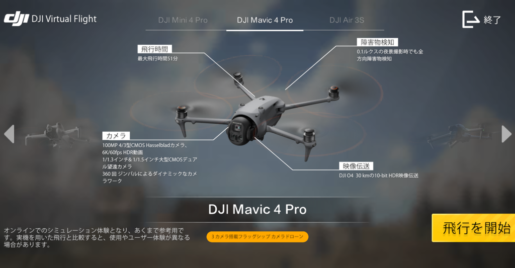 機体は、Mavic 4Pro、Air3s、Mini5 Proから選べます。