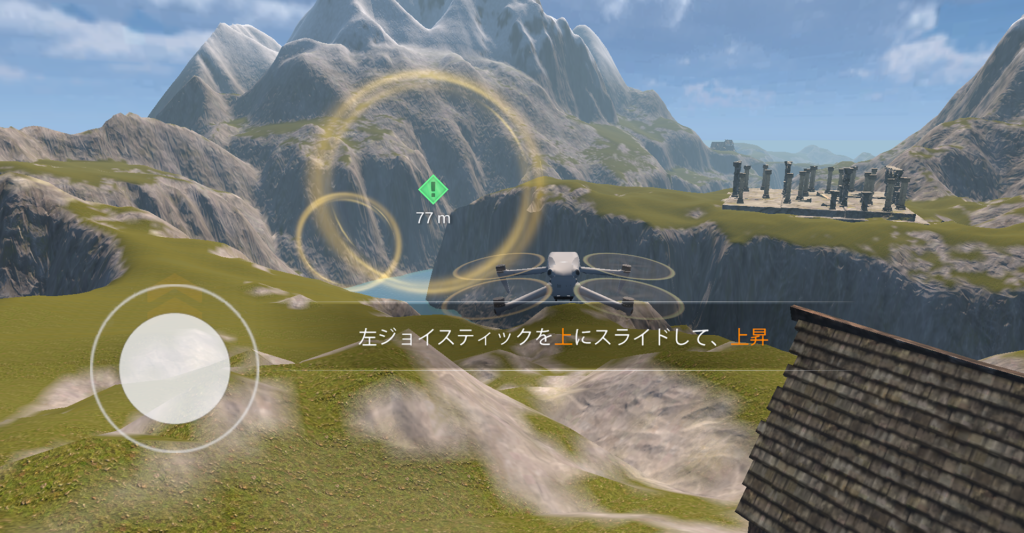 飛行操作に慣れてきたら、カメラのチルト(上下の角度)を動かしながら飛ばす練習を加えましょう。