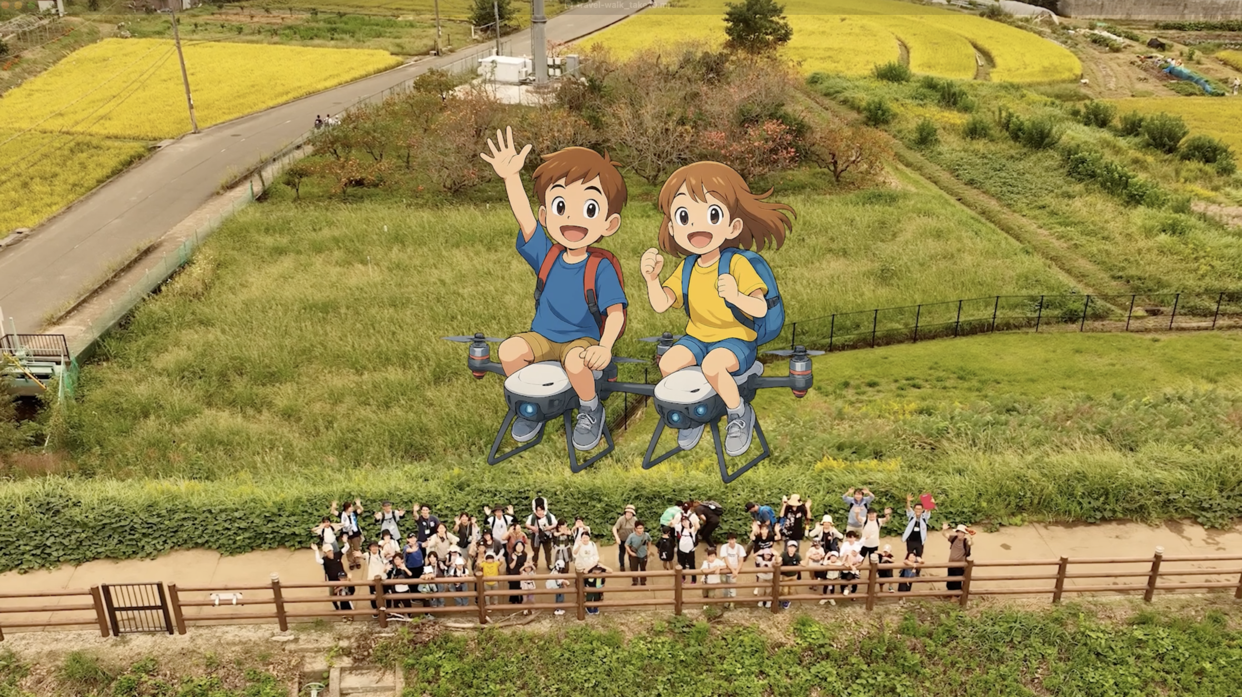 その模様をドローンで空撮。自分の住む町のことをひとつひとつ楽しみながら学んでいく、ワクワクと胸を踊らせている子供達の姿はとても新鮮でした。